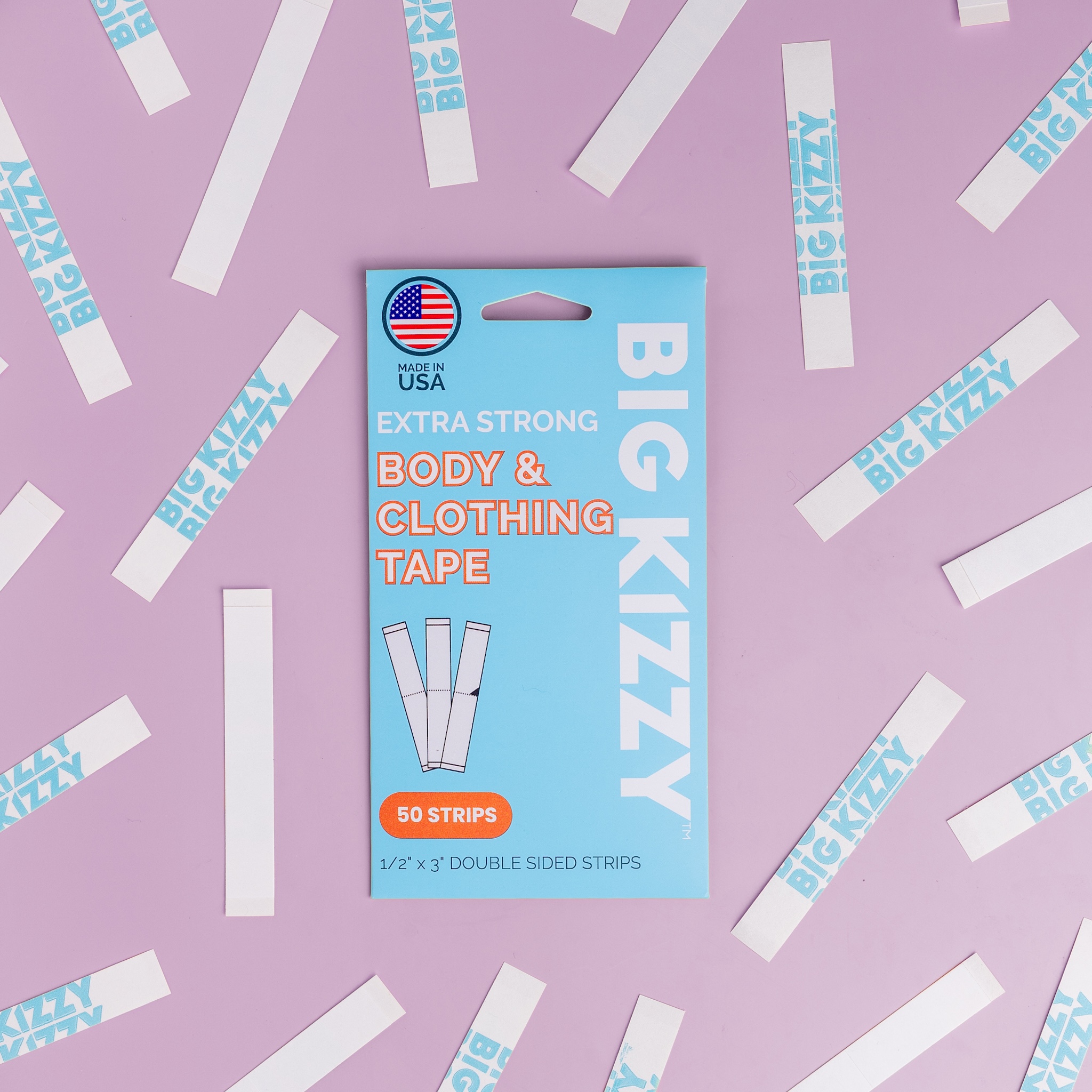 Package and strips of Big Kizzy body and clothing tape.Fan of adhesive strips with descriptive labels on a light blue background.